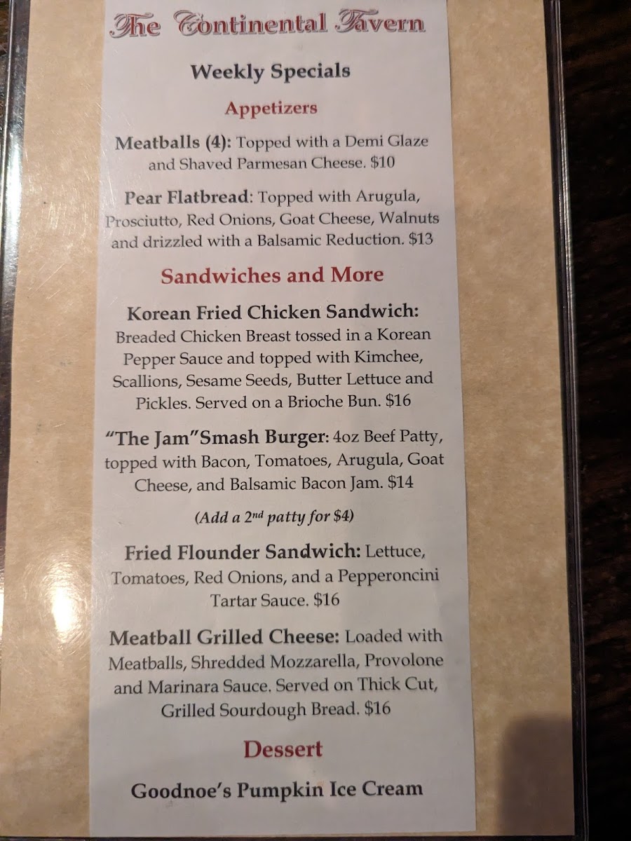 The atmosphere at Continental Tavern is a harmonious blend of casual and vibrant. Diners can enjoy their meals either indoors, where lively conversations fill the air, or outdoors on the lovely porch during pleasant evenings. Customers have noted the amiable service from staff like Aiden and Sage, who add a personal touch to each visit, making you feel right at home. The combination of flavorful dishes, a lively ambiance, and attentive service sets the scene for memorable moments with friends and family.